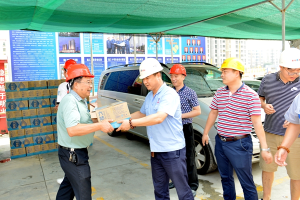 7月26日下午,集团公司党委委员、总工程师齐文深入秦地房地产开发公司“拉克雷公馆”项目施工现场,看望和慰问在酷暑天气下坚守工作岗位的建设者,为他们送去防暑降温慰问品。