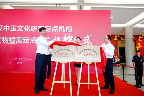 7月20日,陕西历史博物馆与陕西地矿集团在博物馆序言大厅举行文物检测定点单位及汉中玉文化研究定点机构揭牌仪式。陕西历史博物馆党委书记、馆长强跃,陕西地矿集团党委书记、董事长赵廷周共同为“文物检测定点单位”及“汉中玉文化研究定点机构”揭牌。陕西历史博物馆党委副书记、副馆长王炜林,副馆长程旭,陕西地矿集团党委委员、副总经理、工会主席白林科,副总经理何淑萍出席揭牌仪式。