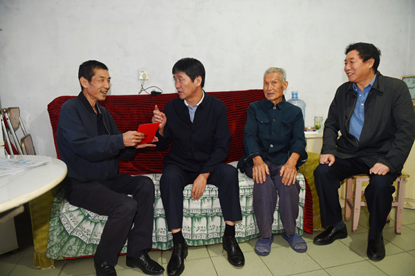 赵廷周一行首先来到物化探队队部,看望慰问了复转军人许朝阳同志和他的家人。他了解到许朝阳同志自1989年转业到物化探队工作至今,工作、生活稳定,女儿已上大学,由衷地感到欣慰。当得知许朝阳同志年逾八旬的老父亲也是位复转军人时,他高兴地拉着老人的手嘘寒问暖,“好呀,我今天看望慰问你们两代军人、两代地质人。”同时送上慰问金。