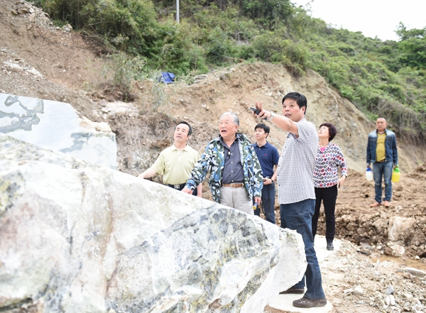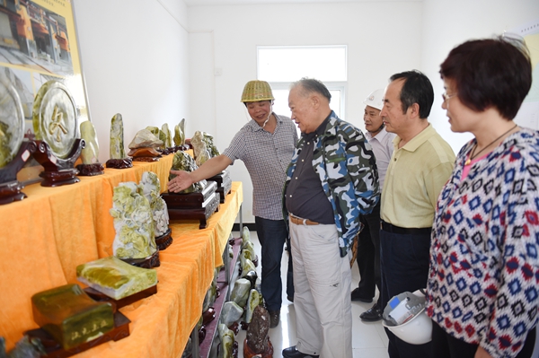 13日下午5时许,经过近10个小时的颠簸,老部长一行驱车来到位于汉中米仓山腹地的南郑县汉元公司碑坝矿山。老部长察看了3个玉石采场,每到一处,都要用放大镜、专用强光手电,仔细鉴别玉石颜色、品质、透明度等地质特征,不时地向随行的矿山负责同志了解玉材生产、运输等情况。老部长还与一线职工亲切交谈,询问他们的工作、生活和收入状况,叮嘱大家千万要注意安全。