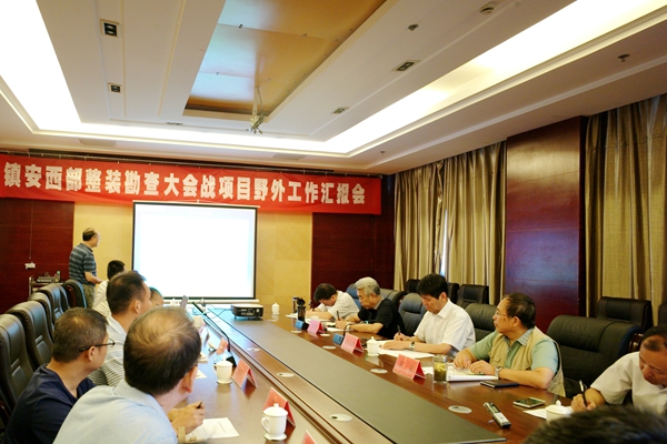 随后,赵廷周董事长、齐文总工程师、万兆发副总工程师出席了在镇安县召开的整装勘查区大会战项目野外工作汇报会。作为勘查主体单位,西安地勘院总工程师陈陇刚向赵廷周一行汇报了大会战项目推进情况。详细介绍了会战实施方案、各个勘查项目进展情况和取得的主要找矿成果。西安地勘院院长陈磊、综合地质大队队长安林、矿业开发工贸公司副总经理胡雪生分别作了表态发言。