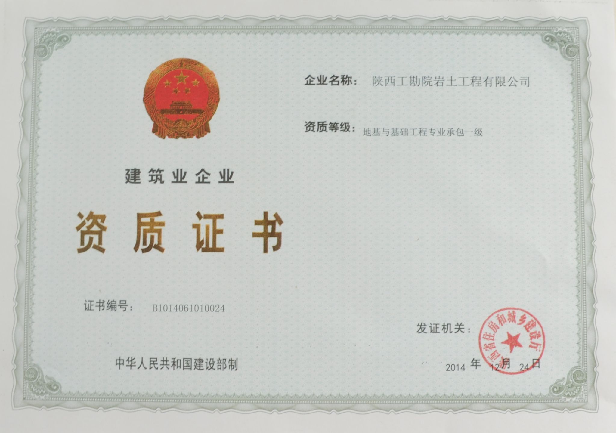 2014年12月24日,陕西工程勘察研究院岩土有限公司,获得了由陕西住房和城乡建设部颁发的地基与基础工程专业承包一级资质,同时具备土石方工程专业承包三级、建筑装饰工程专业承包三级资质。