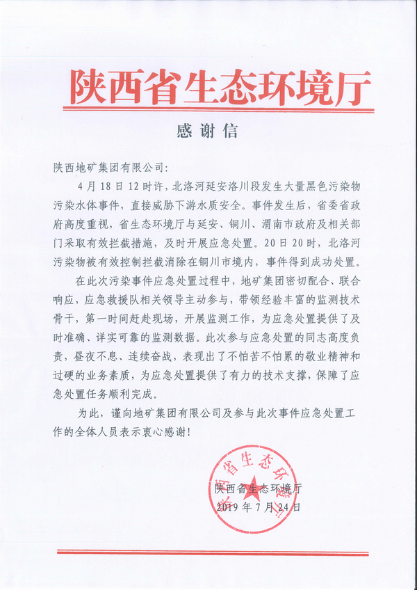 陕西省生态环境厅给地矿集团公司发来感谢信: