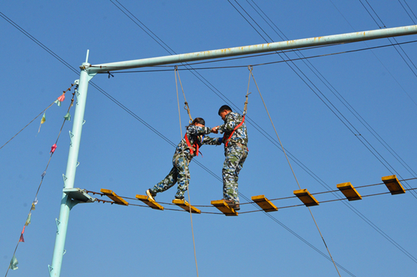 拓展训练前,有针对性地进行了名为“信任队友”的开训仪式。通过一系列欢快的活动,打破了人与人之间的隔阂,建立起相互信任的基础。训练开始后,基地教练将参训员工分为四组,前两组进行了真人CS对战,让员工在体验中放松自己,在真实对抗情境中激发出勇气谋略和信念,增强集体意识和团队责任心。后两组进行了缅甸桥(高空走钢丝)、木屐行走等项目,进一步增强了自信心和相互之间的信任,培养了乐于与人相处共事的积极态度。