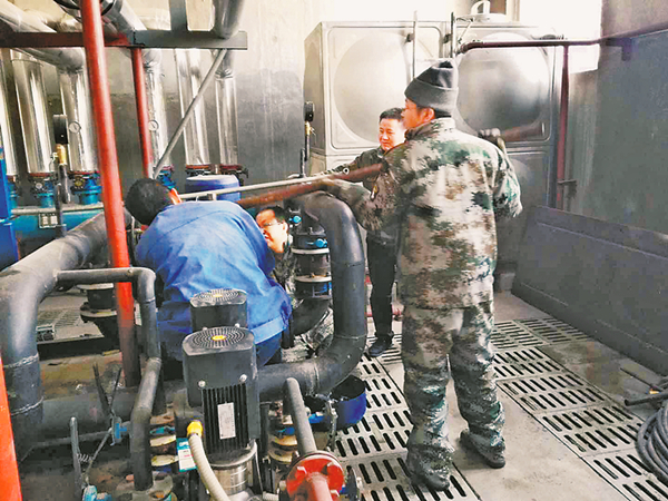 1月12日早上8时,第三地质队换热站工作人员在巡查过程中发现上述问题,及时向科室领导汇报。经过现场查看分析,大家及时制订了维修方案,抓紧时间进行抢修。一声令下,所有人分头行动:物业中心郑泽凌负责外购轴承配件,王永利副主任带领水电组王兴、孟宪发及李军会拆卸1#循环泵电机。虽然室内空间狭小,但是他们依然克服各种困难,手抬肩扛,及时把电机拆卸下来。由于轴承抱死,专业工具无法卸下,王永利迅速联系维修点及运输车辆,同郑泽凌、王兴把电机轴体运送到县城北门进行切割。运回时已是中午时分,大家发扬一不怕苦,二不怕累的精神,来不及休息,及时修复了1#循环泵电机。安装完成启动后,又连续作战,更换了2#循环泵电机轴承并一次试机成功。