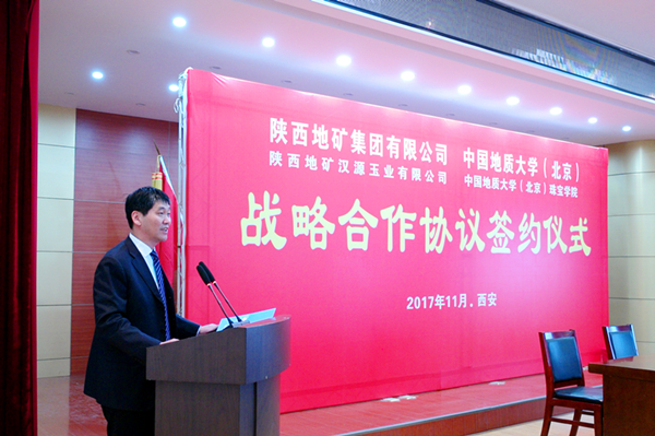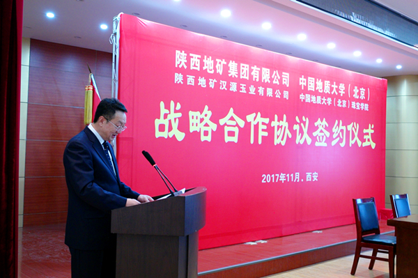 赵廷周在致辞中说,中国地质大学(北京)作为教育部直属的全国重点大学,是国内地学教育的排头兵和国际地学界的知名学府。建校65年来,为全国各行业输送了大批的优秀人才,为我国经济社会发展奠定了重要的基础,为人类社会发展注入了不竭的动力。陕西地矿集团与中国地质大学(北京)渊源深厚,联系紧密。陕西地矿集团的许多领导干部和技术骨干,都是中国地质大学(北京)培养的。特别是近年来,双方在学生就业、人才培养等方面,进一步加大了合作力度,结出了丰硕成果。改企以来,陕西地矿集团聚焦“转型升级”,奋力“追赶超越”,提出了三大发展战略。在三大发展战略的引领下,企业得到了快速发展。企业的发展离不开人才的支撑。陕西地矿集团的核心价值观,就是使每一名员工都能得到全面发展。因此,陕西地矿集团需要进一步扩大和加深与中国地质大学(北京)之间的合作。此次战略合作协议的签订,将为双方在原有合作的基础上搭建更高层次的合作平台,拓展更加广阔的合作空间。