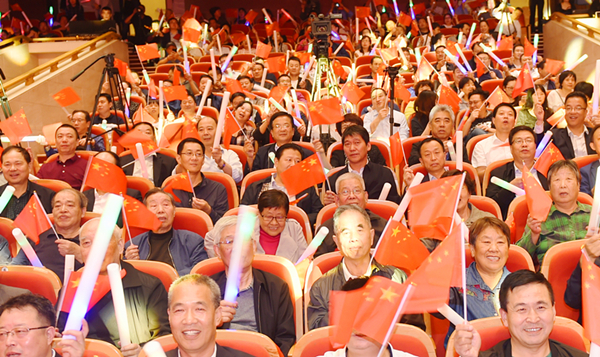 情景表演《岁月如歌》,歌舞《我们的幸福生活》《我爱你中国》《美好新时代》,舞蹈《追梦》《出水莲》《茉莉花》《丝路霓裳》《燃青春》,热情讴歌党,讴歌祖国,讴歌人民。现场观众舞动手中的国旗,人民剧院成了一片红色的海洋。