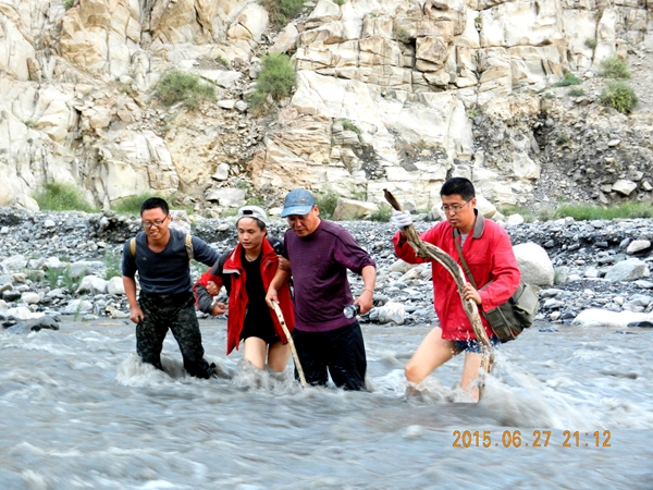 晚上8点半,全部人员到达大河边。此时距离车辆还有6公里左右的路程,道路完全冲毁,需要过7次河。面对湍急浑浊的河水,大家心里不由得一凉。车就在不远处,驻地有热乎乎的饭菜和舒服的床。但是河水实在太大太急。过河有危险,不过河也不行。大家在一起讨论了很久,最终决定过河。在河岸来来回回走了好几次,最终选好渡口,项目负责冯晓强身先士卒,脱掉裤子,拿起河滩上的枯树枝,稳健地踏入冰冷的河水,一步一步慢慢地摸索着前进。大家都盯着他,只见他离河中心越来越近,突然,河中心泛起了一朵朵白浪,河水打着漩儿。冯晓强的身形一晃,“坏了!他要倒。准备救人!” “不!他稳住了。”大家松了一口气。只见他继续向河中心进发,慢慢地到了河中心,稳住身形向河对岸艰难地前进,终于到达了浅水区。接着,大家在冯晓强的指引下,一个接着一个,平安地渡过了河。杨西明今年50多岁,身形单薄,只见该老汉老当益壮,过河时稳稳当当,事后被誉为“技术流过河”。年轻小伙程犬身形瘦小,快到河心时险些被冲倒,但是依然顽强前进,顺利渡河。渡过一道河,大家信心倍增。随后相互配合着,顺利渡过第二道河、第三道河、第四道河……