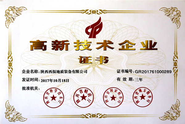 西探地质装备有限公司成立至今,积极投入到高压旋喷产品研发领域,首次获得“国家高新技术企业”认证,标志着西探装备公司在国内高压旋喷产品的研发和创新领域得到国家的肯定和支持。此次西探装备公司荣获“国家高新技术企业”认证,一方面,表明企业自身具有极强的创新意识、良好的经营管理水平和市场开拓能力;另一方面,更是西探装备公司产品在行业内处于领先地位的有力佐证,这是国家权威部门对西探装备公司持续进行产品研发和技术成果转化的高度认可。