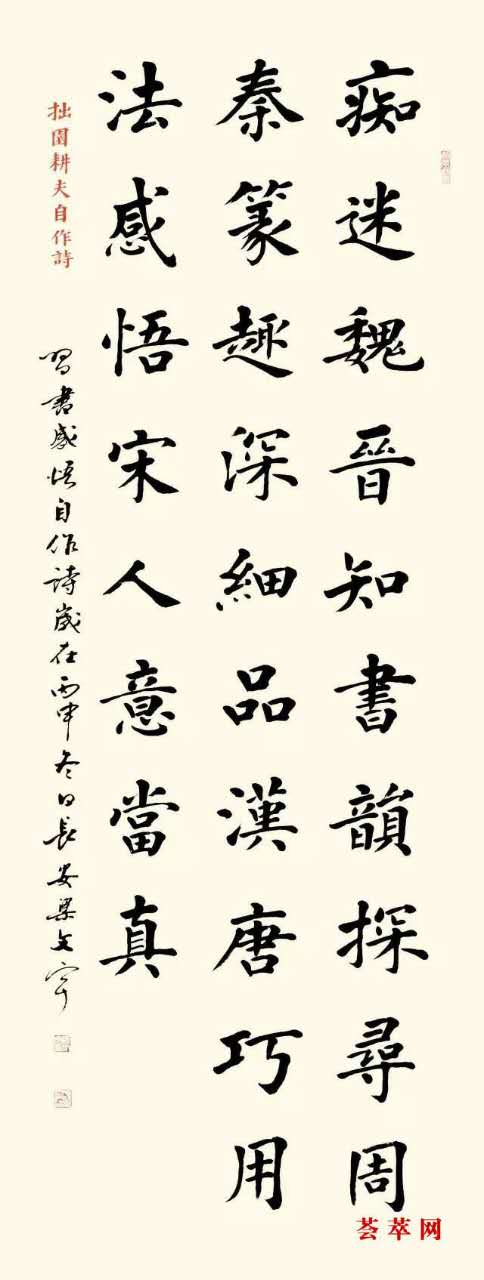 我把书法作为人生的最大乐趣,自喻拙园耕夫。自六岁习字,无论上学、从戎、从政、从教,始终对书法抱有浓厚的兴趣。步入花甲之年后,得以专心从事书法研究、教学和创作,尽享其中的乐趣。