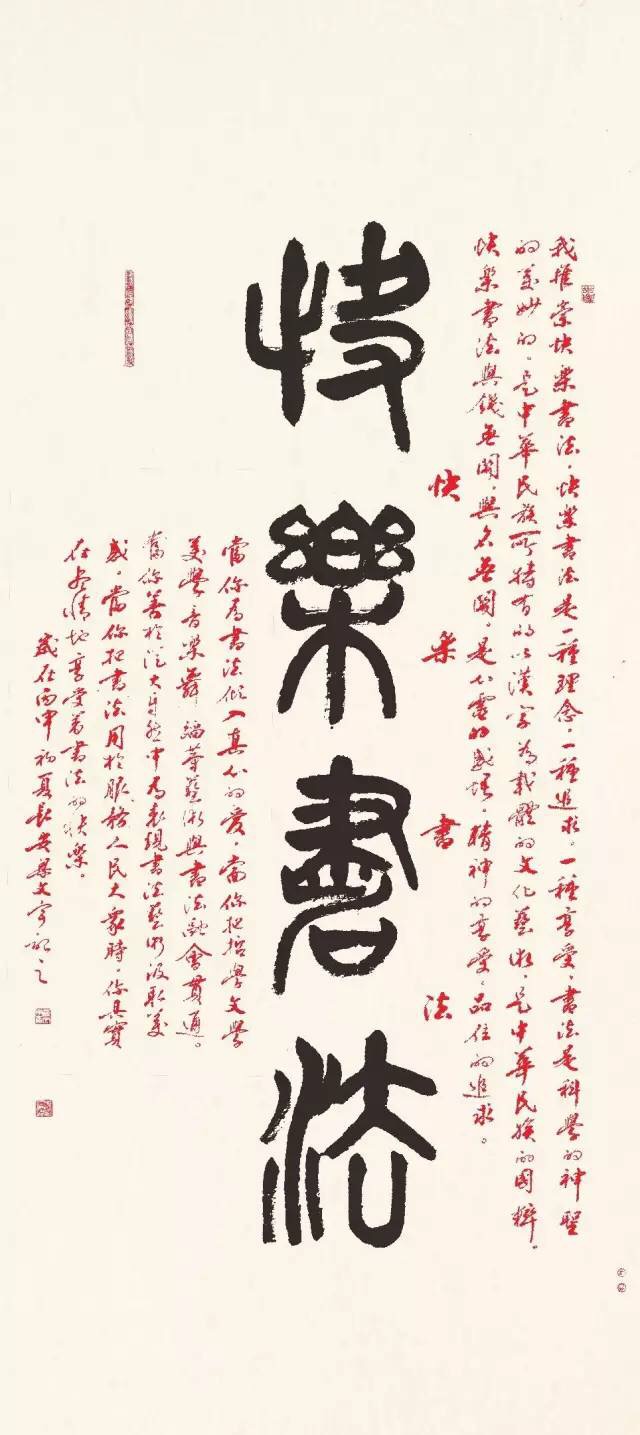 快乐书法强调欲写好字先做好人。写字就是写人生,须有高尚的人品,广博的学识,浓郁的情趣,彰显大气、正气、雅气、豪气,展现美好的人生画卷。